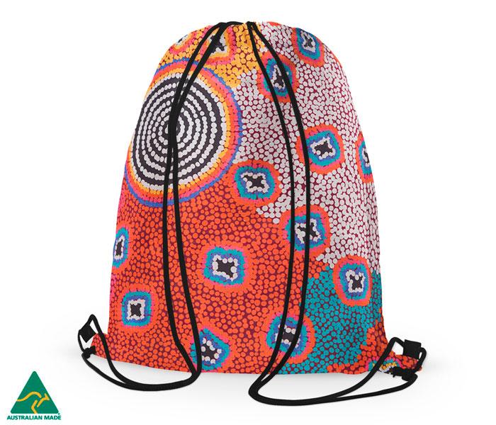 Aboriginal Art drawstring bags include information about the artist and artwork (swing tag).