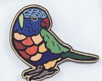 Each brooch is made from Australian timber and features a colourful illustration of Australian botanical, wildlife, and birds, as well as contemporary designs. Each brooch comes packaged in a gift box.