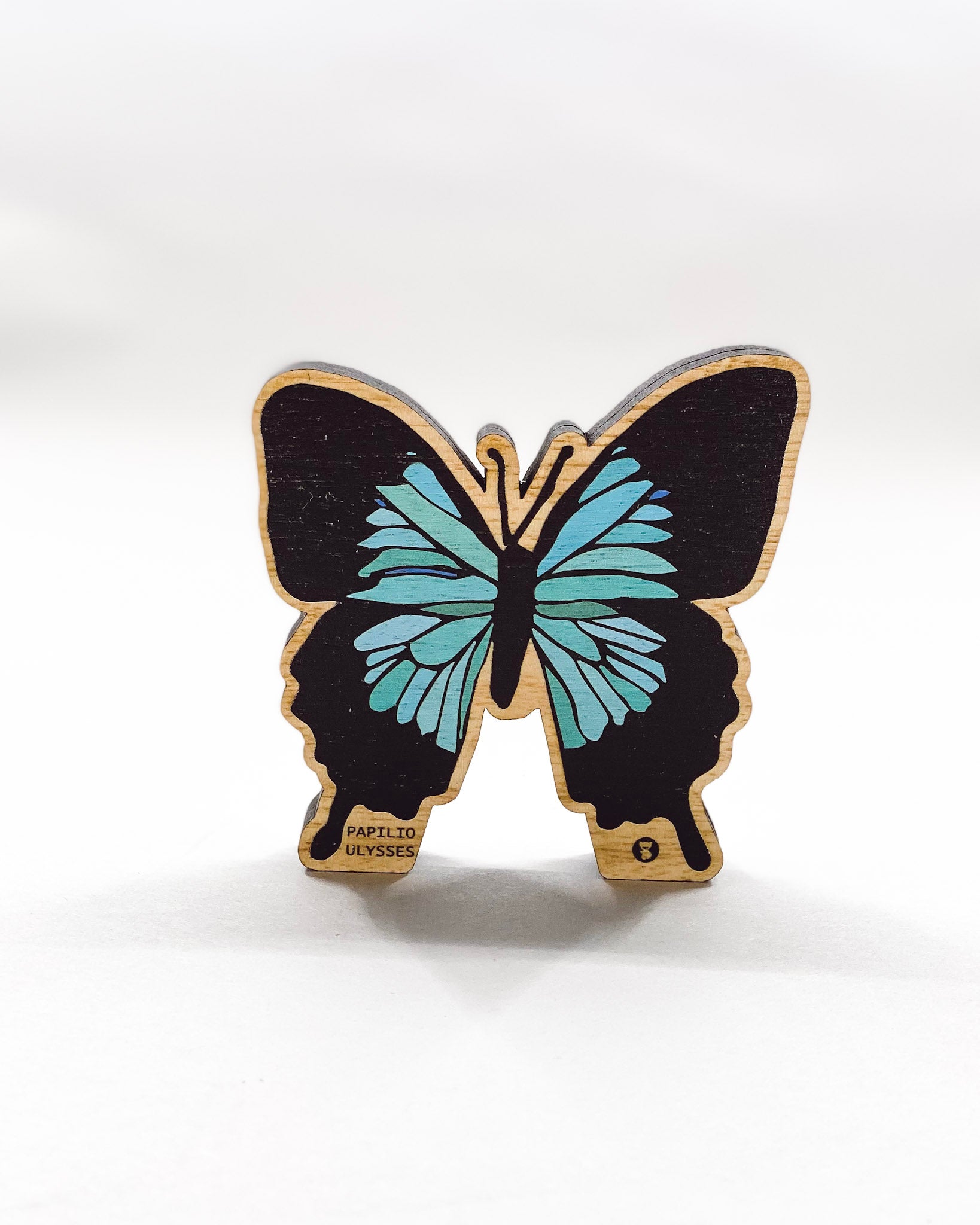 Standing wooden figurine of popular native Australian butterflies. The Papilio Ulysses Butterfly is depicted in bright colours on one side and easily handled. These figures are ideal for small world play.
