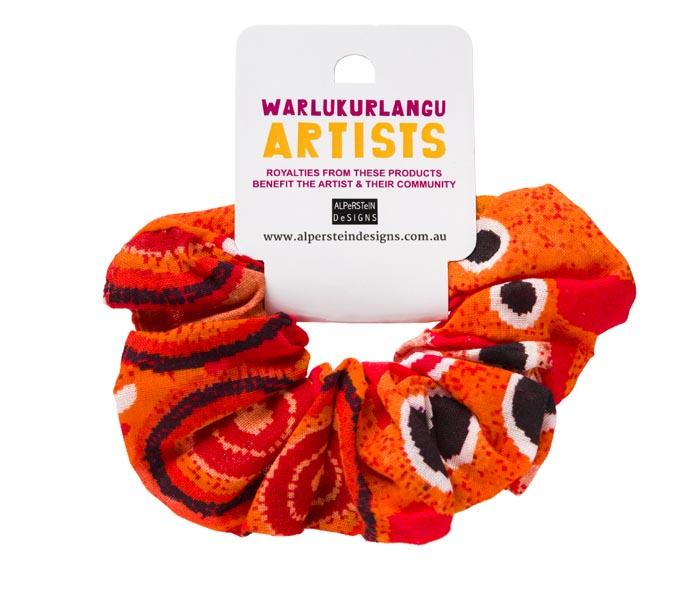 Cotton Hair scrunchies featuring artwork from Warlukurlangu Artists.