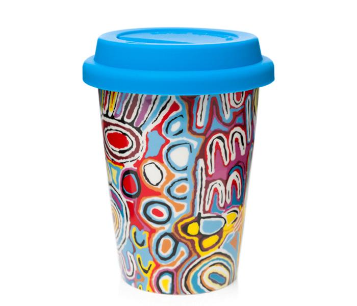 These insulated porcelain mugs featuring artwork by Judy Napangardi Watson from Warlukurlangu Artists.