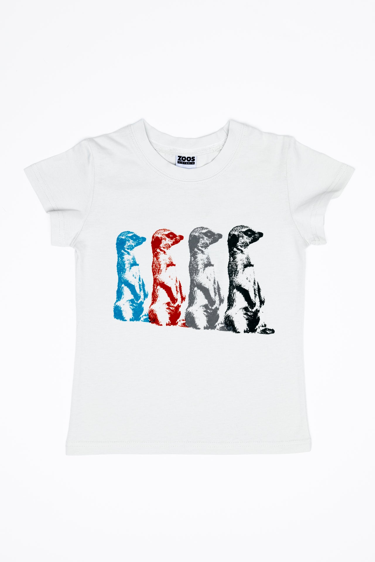 Exclusive designed pop art style t shirt showcases the ever popular meerkats in their unmistakeably recognisable "sentry" position as they keep watch over their mob.