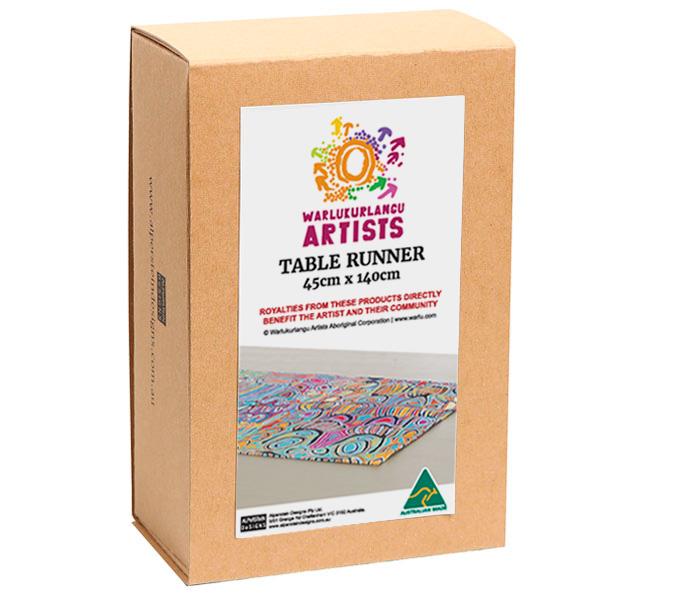 Poly Cotton Table Runner featuring artwork by Judy Napangardi from Warlukurlangu Artists in the Northern Territory, Australia.