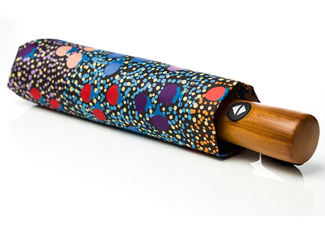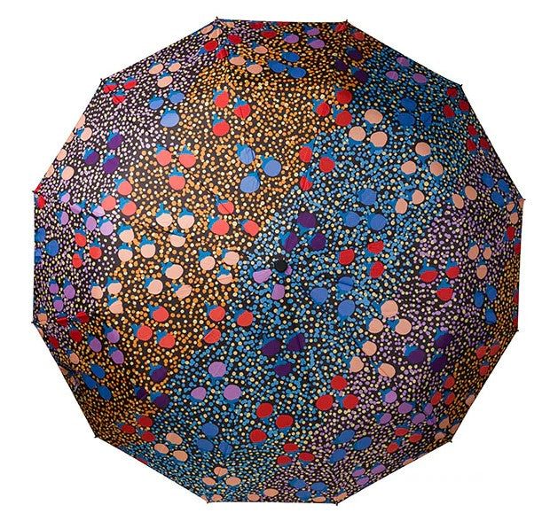 Brighten up even the rainiest days with your very own fold up umbrella featuring artwork by Charlene Marshall from Warlukurlangu Artists.