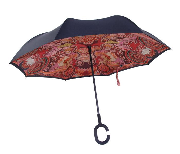 Inside your umbrella features artwork by Theo Faye Nangala Hudson from Warlukurlangu Artists so you can enjoy some beautiful artwork even on the rainiest days! When you arrive to where you need to be, the umbrellas fold in reverse so you can continue enjoying the beautiful print as well as keeping dry!